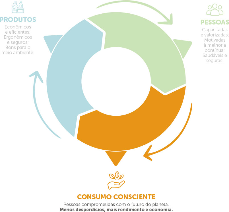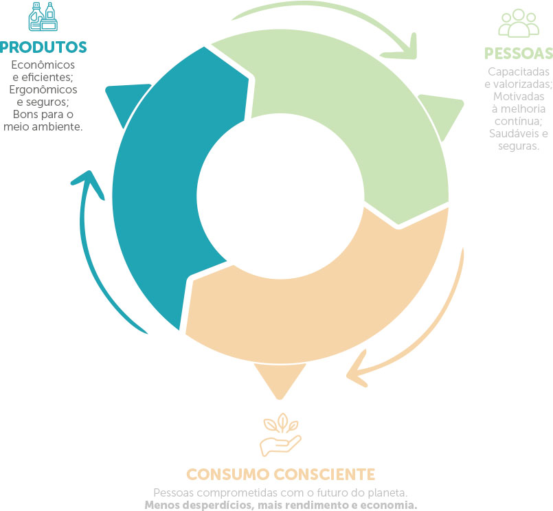 Nosso objetivo é que, este ciclo que envolve PRODUTOS, PESSOAS E CONSUMO CONSCIENTE, gere consumidores exigentes e preocupados em também proporcionar ambientes saudáveis para todos, nos impulsionando na busca incessante da melhoria contínua.